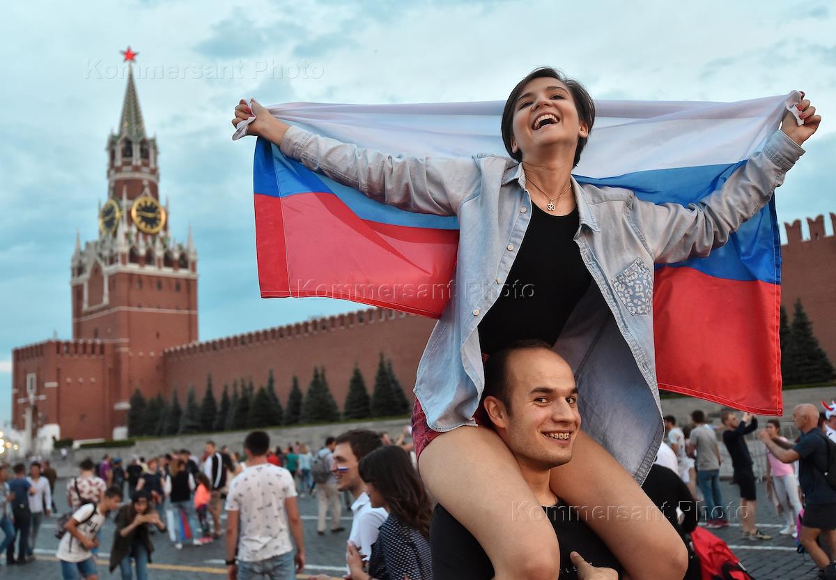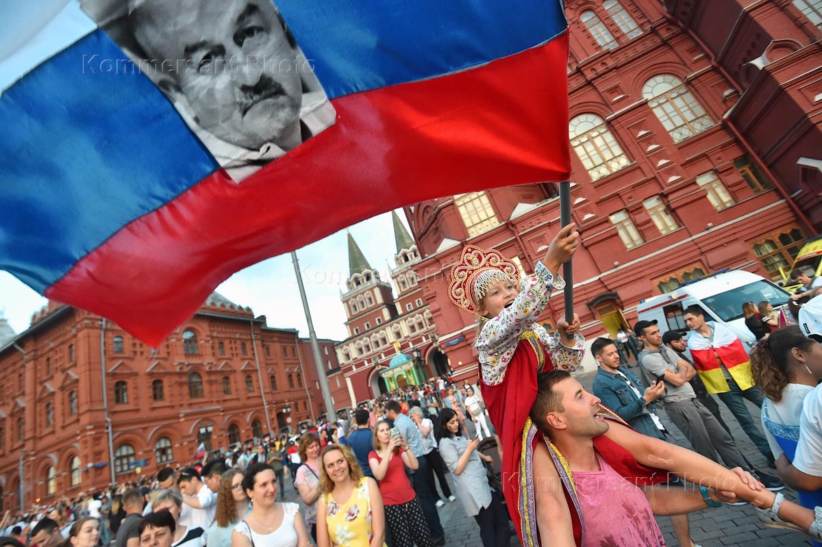Чемпионат мира по футболу в России FIFA 2018. 1/8 финала. Матч между сборными командами России и Испании на стадионе "Лужники". Болельщики на Манежной площади празднуют победу сборной комнады России.