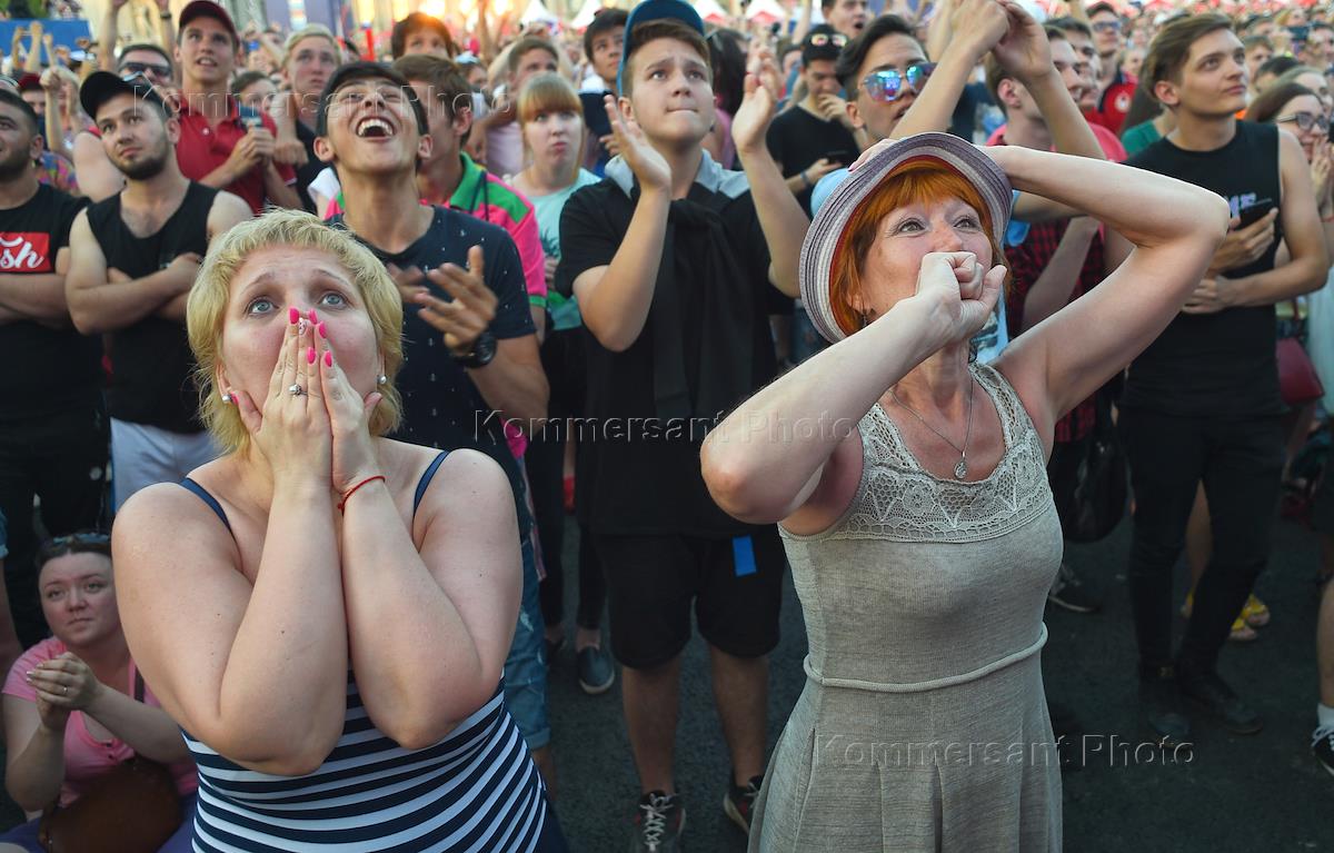 Чемпионат мира по футболу в России FIFA 2018. 1/8 финала. Болельщики смотрят матч между сборными Испании и России на территории фан-зоны в Самаре.