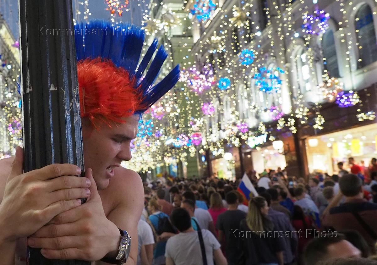 Чемпионат мира по футболу в России FIFA 2018. 1/8 финала. Болельщики сборной России на Никольской улице празднуют победу сборной России в матче со сборной Испании.