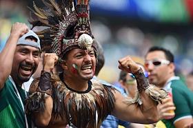Чемпионат мира по футболу в России FIFA 2018. 1/8 финала. Матч между сборными Бразилии и Мексики на стадионе "Самара Арена". Болельщик с маской во время матча.