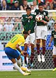 Чемпионат мира по футболу в России FIFA 2018. 1/8 финала. Матч между сборными командами Бразилии и Мексики на стадионе "Самара Арена". Слева направо: игрок сборной Мексики Хезус Гальярдо, игроки сборной Бразилии Неймар и Паулиньо во время матча.