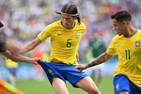 Чемпионат мира по футболу в России FIFA 2018. 1/8 финала. Матч между сборными командами Бразилии и Мексики на стадионе "Самара Арена". Игроки сборной Бразилии Филипе Луис (слева) и Филиппе Коутиньо (справа) во время матча.
