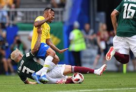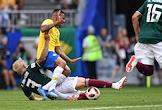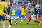Чемпионат мира по футболу в России FIFA 2018. 1/8 финала. Матч между сборными командами Бразилии и Мексики на стадионе "Самара Арена". Слева направо: игрок сборной Мексики Хезус Гальярдо, игроки сборной Бразилии Неймар и Паулиньо во время матча.