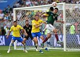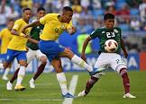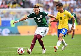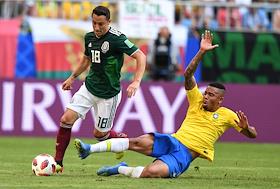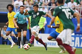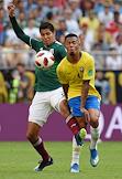 Чемпионат мира по футболу в России FIFA 2018. 1/8 финала. Матч между сборными Бразилии и Мексики на стадионе "Самара Арена". Игрок сборной Мексики Джонатан Дос Сантос (справа) во время матча.