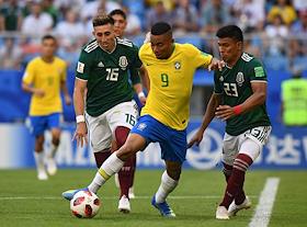 Чемпионат мира по футболу в России FIFA 2018. 1/8 финала. Матч между сборными командами Бразилии и Мексики на стадионе "Самара Арена". Игрок сборной Мексики Хезус Гальярдо (справа) и игрок сборной Бразилии Габриэл Жезус (в центре) во время матча.