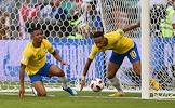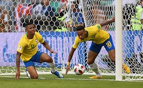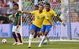 Чемпионат мира по футболу в России FIFA 2018. 1/8 финала. Матч между сборными командами Бразилии и Мексики на стадионе "Самара Арена". Игроки сборной Бразилии Габриэл Жезус (слева) и Неймар (справа) во время матча.