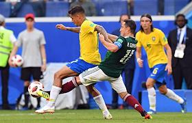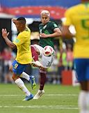 Чемпионат мира по футболу в России FIFA 2018. 1/8 финала. Матч между сборными Бразилии и Мексики на стадионе "Самара Арена". Игоек сборной Мекссики Андрес Гуардадо (справа) и Филппе Коутиньо (слева) во время матча.