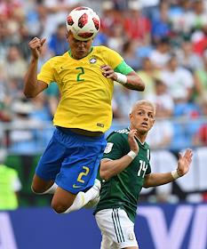 Чемпионат мира по футболу в России FIFA 2018. 1/8 финала. Матч между сборными командами Бразилии и Мексики на стадионе "Самара Арена". Игрок сборной Мексики Хавьер Эрнандес (справа) и игрок сборной Бразилии Тиаго Силва (слева) во время матча.