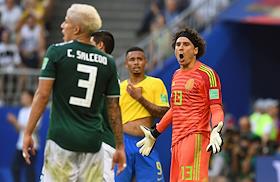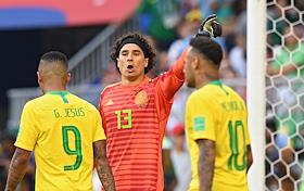 Чемпионат мира по футболу в России FIFA 2018. 1/8 финала. Матч между сборными командами Бразилии и Мексики на стадионе "Самара Арена". Вратарь сборной Бразилии Гильермо Очоа (в центре) во время матча.
