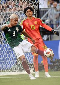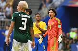 Чемпионат мира по футболу в России FIFA 2018. 1/8 финала. Матч между сборными командами Бразилии и Мексики на стадионе "Самара Арена". Игрок сборной Мексики Карлос Сальседо (слева) и вратарь сборной Бразилии Гильермо Очоа (справа) во время матча.