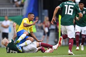 Чемпионат мира по футболу в России FIFA 2018. 1/8 финала. Матч между сборными командами Бразилии и Мексики на стадионе "Самара Арена". Игрок сборной Мексики Карлос Сальседо (слева) и игрок сборной Бразилии Габриэл Жезус (второй слева) во время матча.