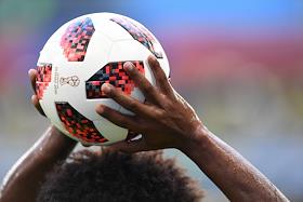 Чемпионат мира по футболу в России FIFA 2018. 1/8 финала. Матч между сборными командами Бразилии и Мексики на стадионе "Самара Арена". Жанровая фотография. Официальный мяч Чемпионата в руках игрока.
