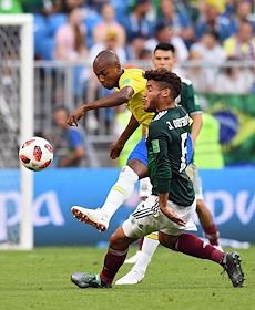 Чемпионат мира по футболу в России FIFA 2018. 1/8 финала. Матч между сборными командами Бразилии и Мексики на стадионе "Самара Арена". Игрок сборной Бразилии Каземиро (слева) и игрок сборной Мексики Андрес Куардадо (справа) во время матча.