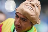 Чемпионат мира по футболу в России FIFA 2018. 1/8 финала. Матч между сборными Бразилии и Мексики на стадионе "Самара Арена". Болельщик с маской во время матча.