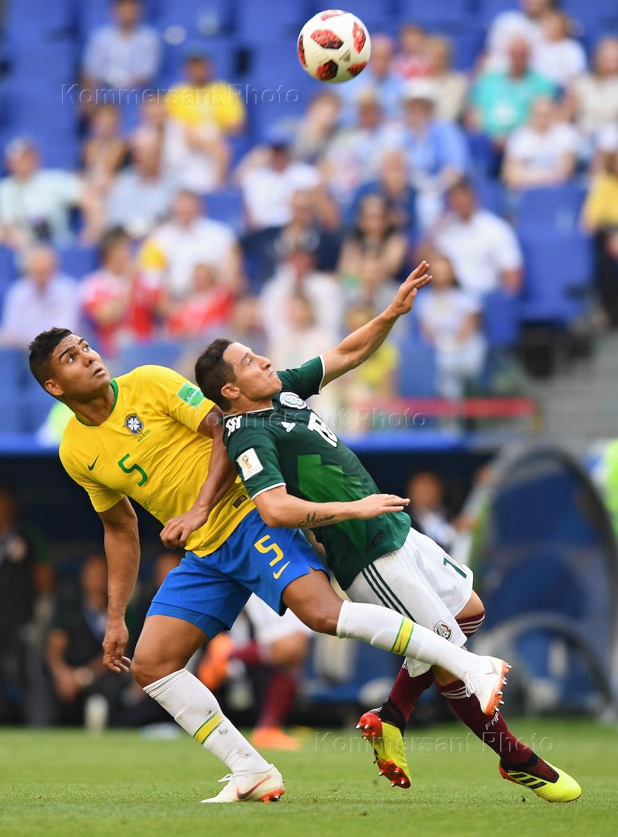 Чемпионат мира по футболу в России FIFA 2018. 1/8 финала. Матч между сборными командами Бразилии и Мексики на стадионе "Самара Арена". Игрок сборной Бразилии Каземиро (слева) и игрок сборной Мексики Андрес Куардадо (справа) во время матча.