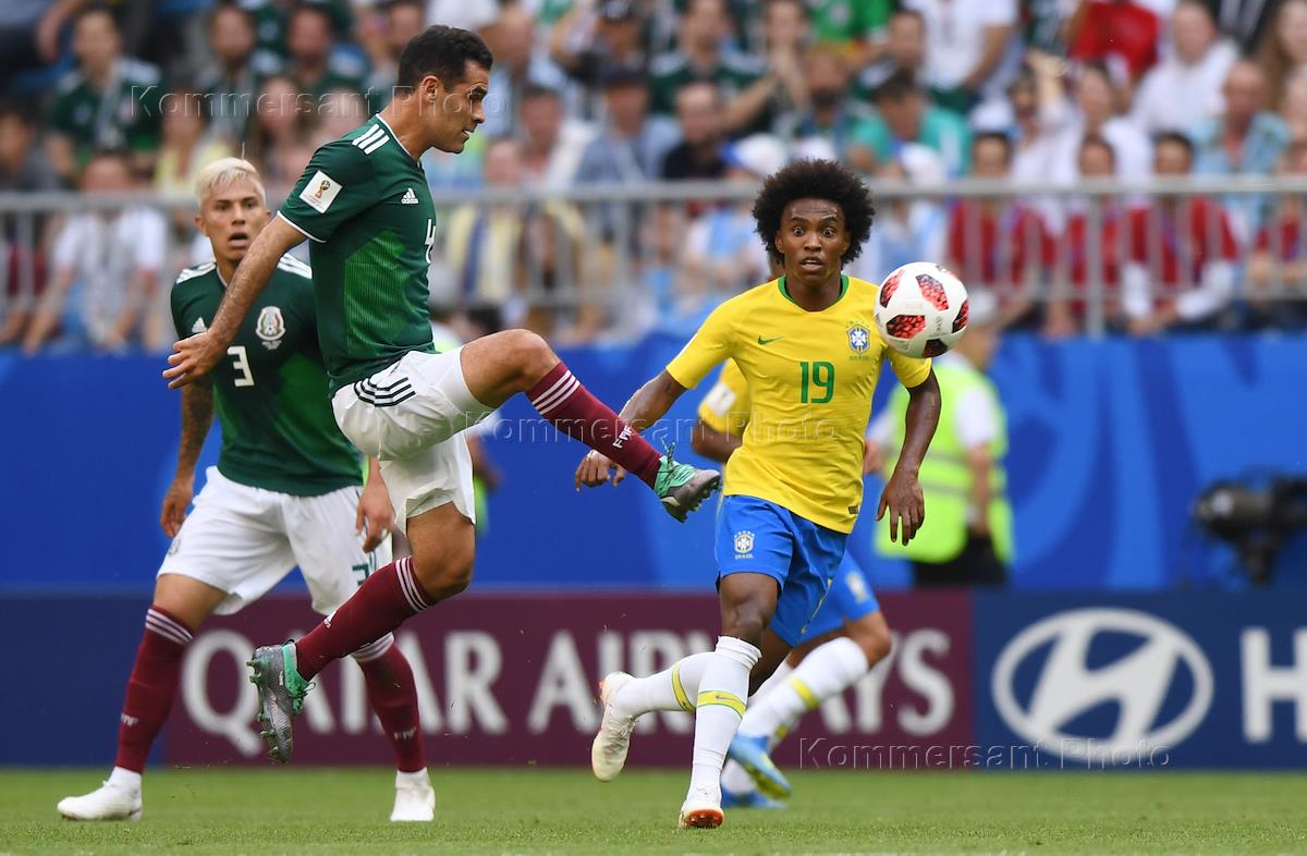 Чемпионат мира по футболу в России FIFA 2018. 1/8 финала. Матч между сборными командами Бразилии и Мексики на стадионе "Самара Арена". Игрок сборной Бразилии Виллиан (справа) и игрок сборной Мексики Карлос Сальседо (слева) во время матча.