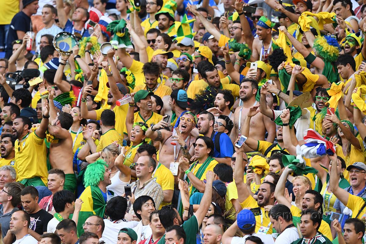Чемпионат мира по футболу в России FIFA 2018. 1/8 финала. Матч между сборными командами Бразилии и Мексики на стадионе "Самара Арена". Болельщики перед началом матча.