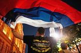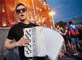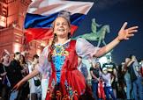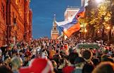 Чемпионат мира по футболу в России FIFA 2018. 1/8 финала. Матч между сборными командами России и Испании. Болельщики сборной команды России празднуют победу своей команды в матче.