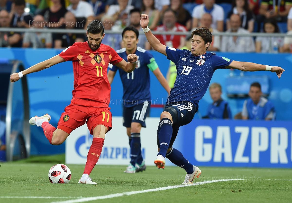 Чемпионат мира по футболу в России FIFA 2018. 1/8 финала. Матч между сборными командами Японии и Бельгии на стадионе "Ростов Арена". Игрок сборной Бельгии Янник Карраско (справа) и игрок сборной Японии Гэнки Харагути (слева) во время матча.