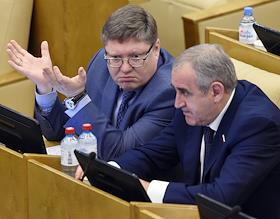 Пленарное заседание Государственной думы (ГД) России. Первый заместитель председателя комитета ГД по труду, социальной политике и делам ветеранов Николай Коломейцев (слева) и первый заместитель председателя комитета ГД по государственному строительству и законодательству Юрий Синельщиков (справа) перед началом заседания.