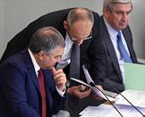 Пленарное заседание Государственной думы (ГД) России. Слева направо: председатель комитета ГД по бюджету и налогам Андрей Макаров, член комитета ГД России по бюджету и налогам Андрей Исаев и заместитель председателя Государственной думы России, руководитель фракции партии "Единая Россия" Сергей Неверов перед началом заседания.