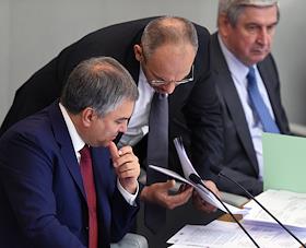 Пленарное заседание Государственной думы (ГД) России. Председатель Государственной Думы России Вячеслав Володин (слева) и председатель комитета Государственной думы России по природным ресурсам, собственности и земельным отношениям Николай Николаев (второй слева) перед началом заседания.