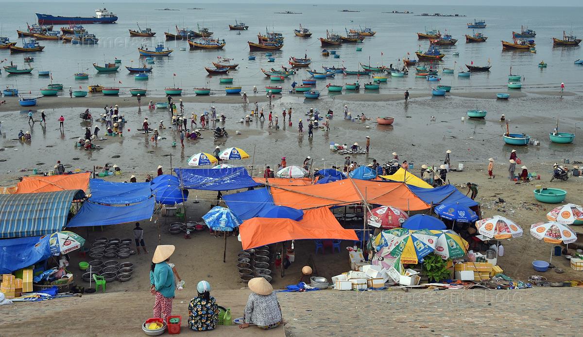 Рыбацкая деревня в Муйне, южновьетнамской провинции Биньтхуан (Фантьет). Рыбаки на лодках в море.