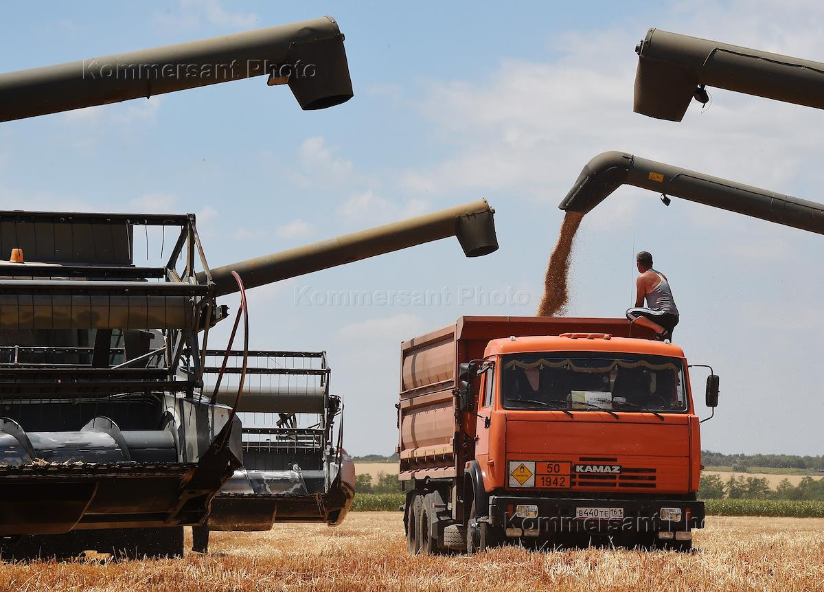 Сбор урожая зерновых. Комбайны в поле вовремя уборки зерна.