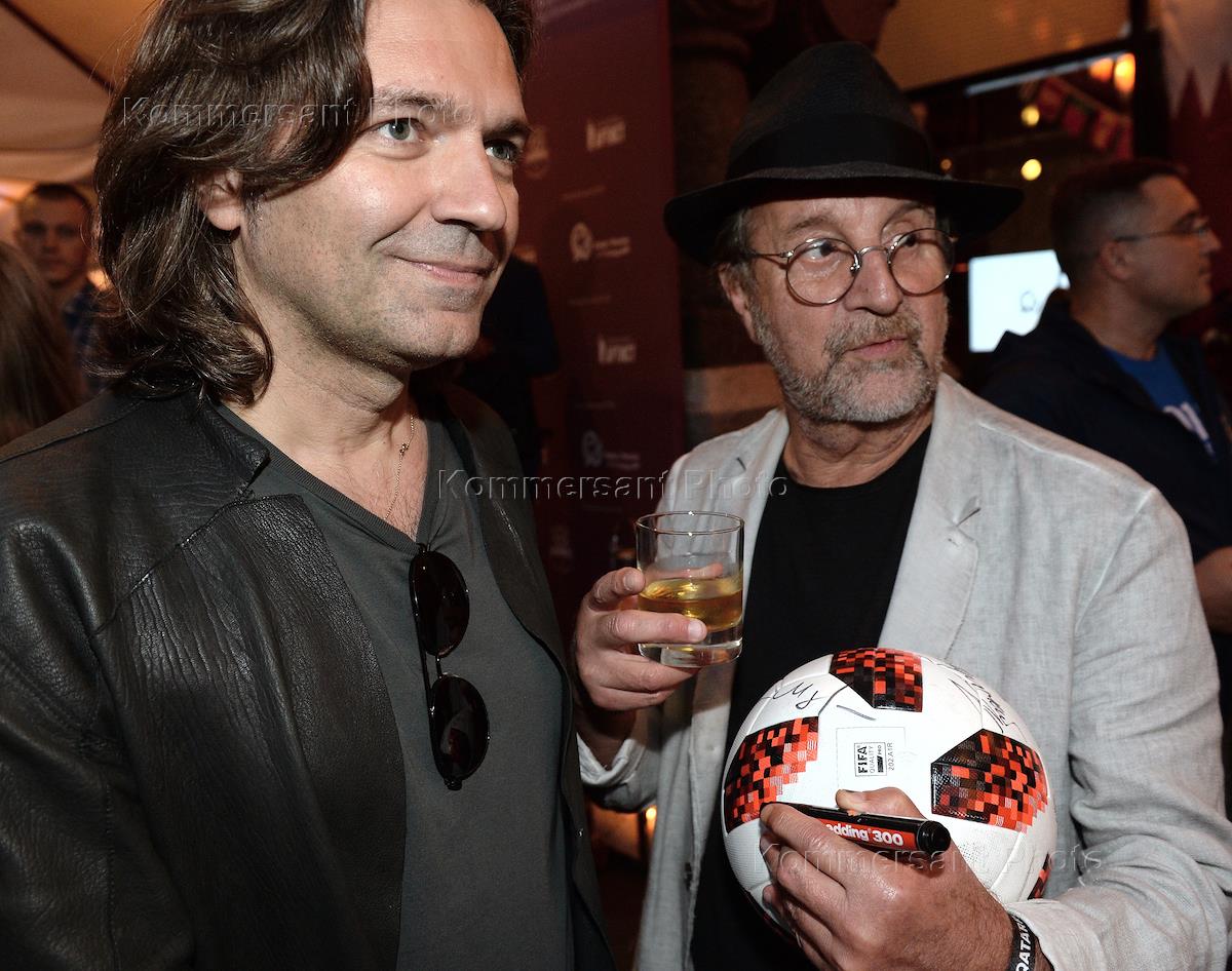 Коктейль в "Боско Кафе" по случаю символической передачи эстафеты проведения Чемпионата мира по футболу FIFA 2022 Катару. Композитор, певец Дмитрий Маликов (слева) и актер Леонид Ярмольник (справа) на коктейле.