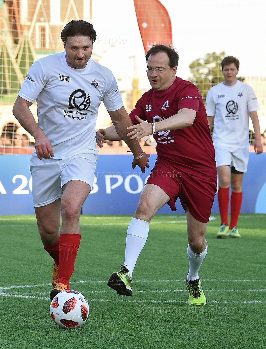 Дружеский матч по футболу между командами артистов и политиков России и представителей Катара в "Парке футбола" на Красной площади. Генеральный директор телеканала "Звезда" Алексей Пиманов (слева) и певец, композитов Дмитрий Маликов (справа) во время матча.