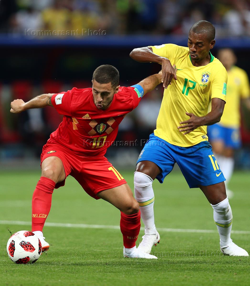 Чемпионат мира по футболу в России FIFA-2018. 1/4 финала. Матч между сборными Бразилии и Бельгии на стадионе "Казань Арена". Игрок сборной Бельгии Эден Азар (слева) и игрок сборной Бразилии Фернандиньо (справа) во время матча.