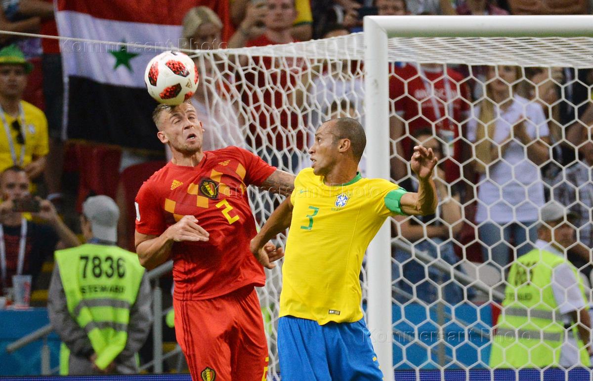 Чемпионат мира по футболу в России FIFA-2018. 1/4 финала. Матч между сборными Бразилии и Бельгии на стадионе "Казань Арена". Игрок сборной Бельгии Тоби Алдервейрелд (слева) и игрок сборной Бразилии Миранда (справа) во время матча.