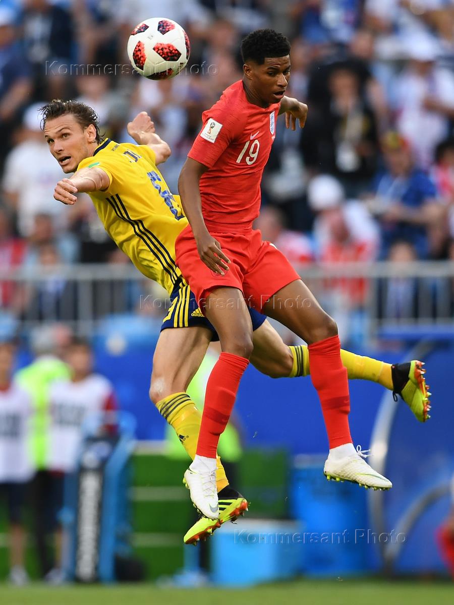 Чемпионат мира по футболу в России FIFA-2018. 1/4 финала. Матч между сборными Швеции и Англии прошел на стадионе "Самара Арена". Игрок сборной Швеции Альбин Экдаль (слева) и игрок сборной Англии Маркус Рэшфорд (справа) во время матча.