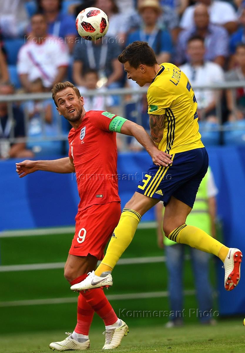 Чемпионат мира по футболу в России FIFA-2018. 1/4 финала. Матч между сборными Швеции и Англии прошел на стадионе "Самара Арена". Игрок сборной Англии Гарри Кейн (справа) и игрок сборной Швеции Виктор Линделеф (слева) во время матча.