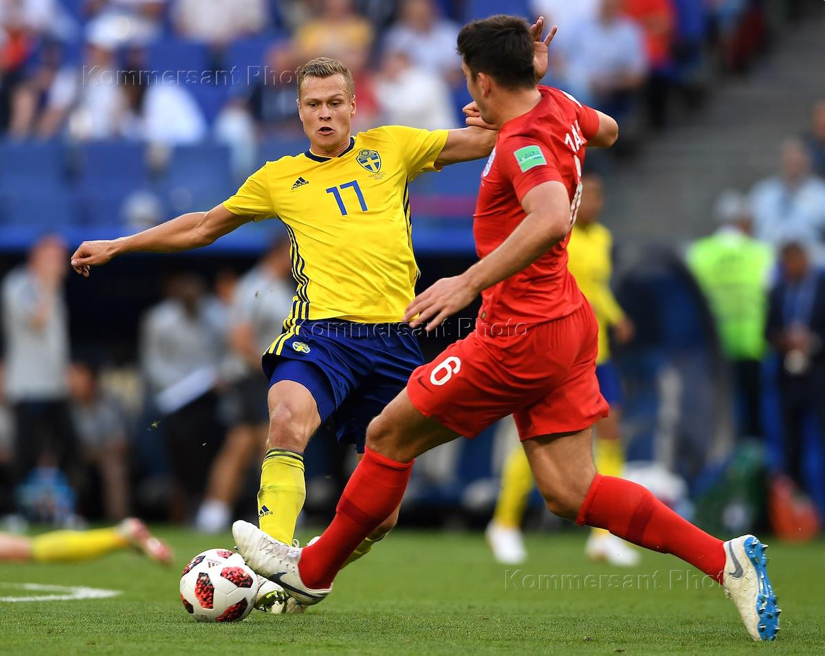 Чемпионат мира по футболу в России FIFA-2018. 1/4 финала. Матч между сборными Швеции и Англии прошел на стадионе "Самара Арена". Игрок сборной Швеции Эмиль Крафт (справа) во время матча.