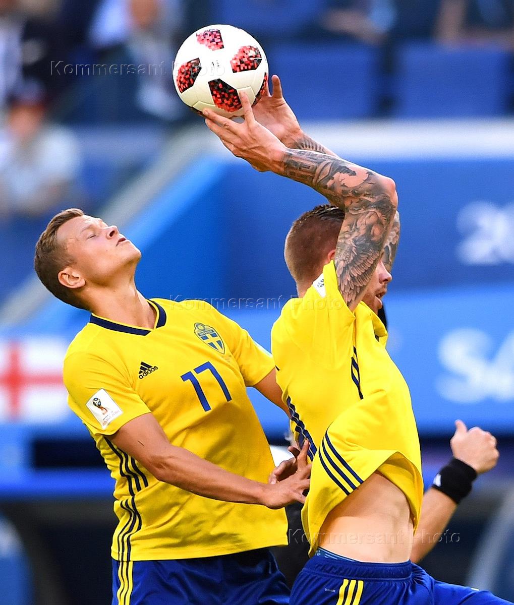 Чемпионат мира по футболу в России FIFA-2018. 1/4 финала. Матч между сборными Швеции и Англии прошел на стадионе "Самара Арена". Игроки сборной Швеции Виктор Классон (слева) и Понтус Янссон (справа) во время матча.