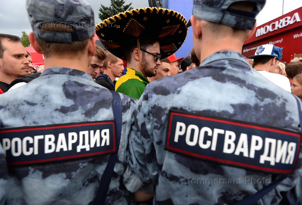 Демонстрация Кубка Стэнли, привезенного российским нападающим клуба Национальной хоккейной лиги (НХЛ) "Вашингтон Кэпиталз" Александром Овечкиным, в фан-зоне Чемпионата мира по футболу в России FIFA 2018 на Воробьевых горах. Сотрудники Росгвардии перед началом церемонии демонстрации Кубка Стэнли и трансляцией матчей 1/4 финала.
