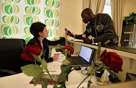 Жанровая фотография. Хостел "Старт" на Вишневой улице. Иностранец у стойки администратора хостела.