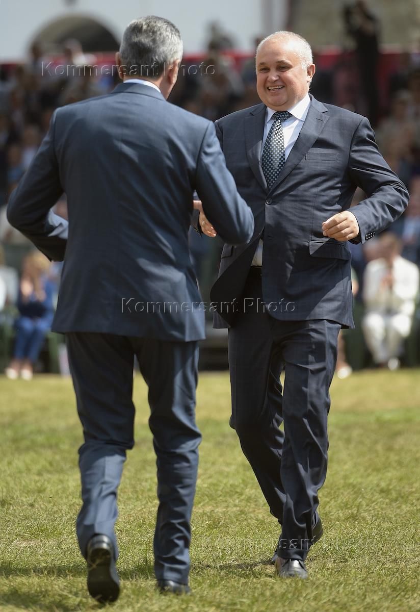 Празднование Дня города. Временно исполняющий обязанности губернатора Кемеровской области Сергей Цивилев (слева) и художественный руководитель Театра-студии Олега Табакова, актер, режиссер Владимир Машков (в центре) во время мероприятия.