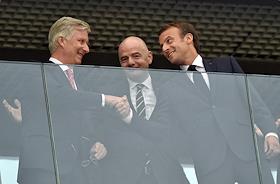 Чемпионат мира по футболу в России FIFA 2018. 1/2 финала. Матч между сборными Франции и Бельгии прошел на стадионе "Санкт-Петербург". Слева направо: король Бельгии Филипп, президент FIFA (ФИФА) Джанни Инфантино и президент Франции Эммануэль Макрон перед началом матча.