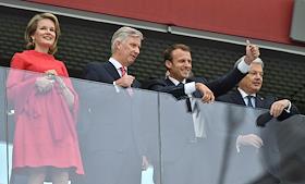 Чемпионат мира по футболу в России FIFA 2018. 1/2 финала. Матч между сборными Франции и Бельгии прошел на стадионе "Санкт-Петербург". Слева направо: королева Бельгии Матильда, король Бельгии Филипп, президент Франции Эммануэль Макрон и министр иностранных и европейских дел Бельгии Дидье Рейндерс перед началом матча.