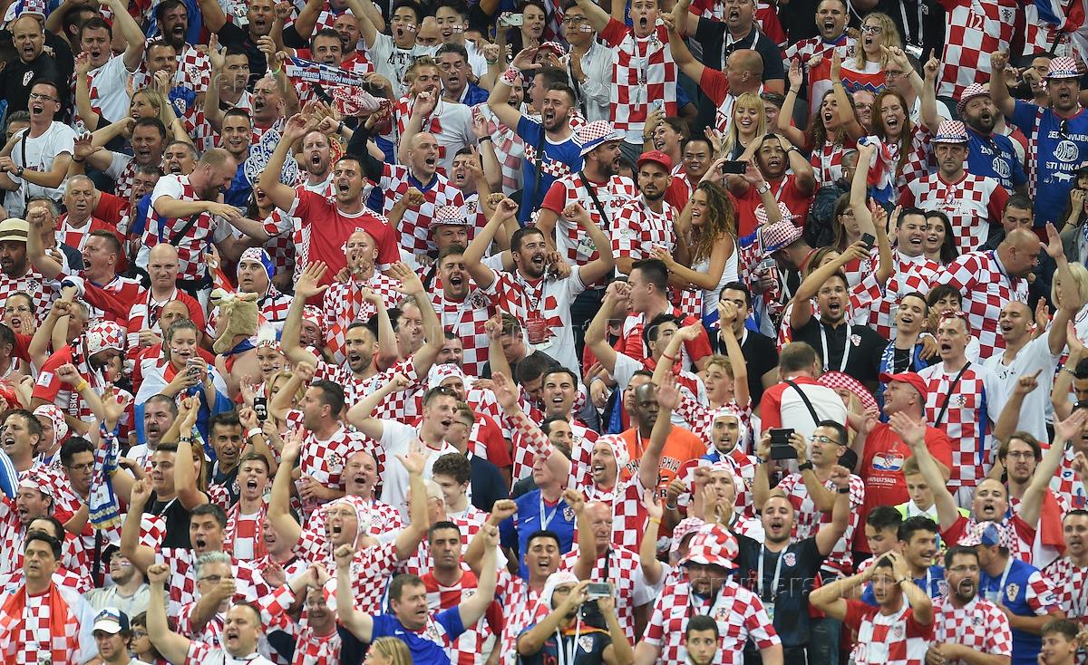 Чемпионат мира по футболу в России FIFA 2018. Полуфинал. Матч между сборными командами Хорватии и Англии на стадионе "Лужники". Болельщики сборной Хорватии на трибуне во время матча.