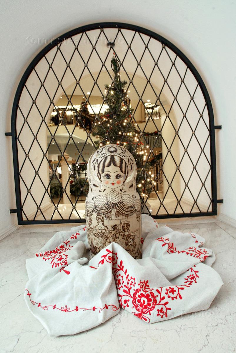 Новогодние интерьеры в гостинице "Марриотт Грандъ Отель". Матрешка и елка в фойе гостиницы.