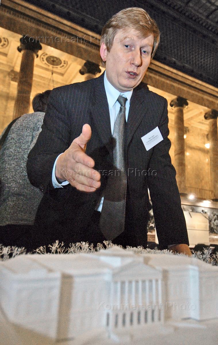 Президент Союза архитекторов России Юрий Гнедовский на пресс-конференции, посвященной подведению итогов конкурса проектов на строительство жилого комплекса и фондохранилища у Михайловского сада. Пресс-конференция прошла в Этнографическом музее.