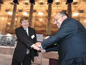 Главный архитектор Санкт-Петербурга Александр Викторов (слева) и глава "Корпорации С" Василий Сопромадзе (справа) на церемонии подведения итогов конкурса проектов на строительства жилого комплекса и фондохранилища у Михайловского сада. Церемония прошла в Этнографическом музее.