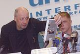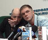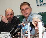 Генеральный директор Издательского дома (ИД) "Коммерсантъ" Андрей Васильев (слева) и политический обозреватель газеты "Коммерсантъ" Андрей Колесников (справа) на пресс-конференции, представителей ИД "Коммерсантъ" и издательства ЭКСМО по случаю выхода в свет книг Андрея Колесникова "Я видел Путина!", "Меня видел Путин!". Пресс-конференция прошла в офисе "Интерфакс".