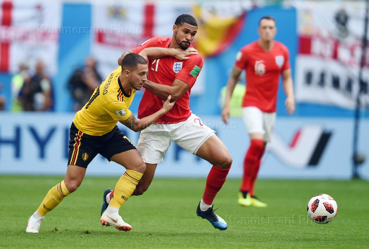 Чемпионат мира по футболу в России FIFA 2018. Матч за 3-е место между сборными командами Бельгии и Англии на стадионе "Санкт-Петербург". Игрок сборной Бельгии Эден Азар (слева) и игрок сборной Англии Рубен Лофтус-Чик (в центре) во время матча.