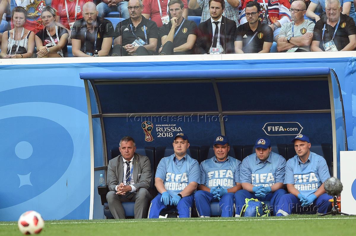 Чемпионат мира по футболу в России FIFA 2018. Матч за 3-е место между сборными Бельгии и Англии на стадионе "Санкт-Петербург". Бригада медиков на скамейке во время матча.