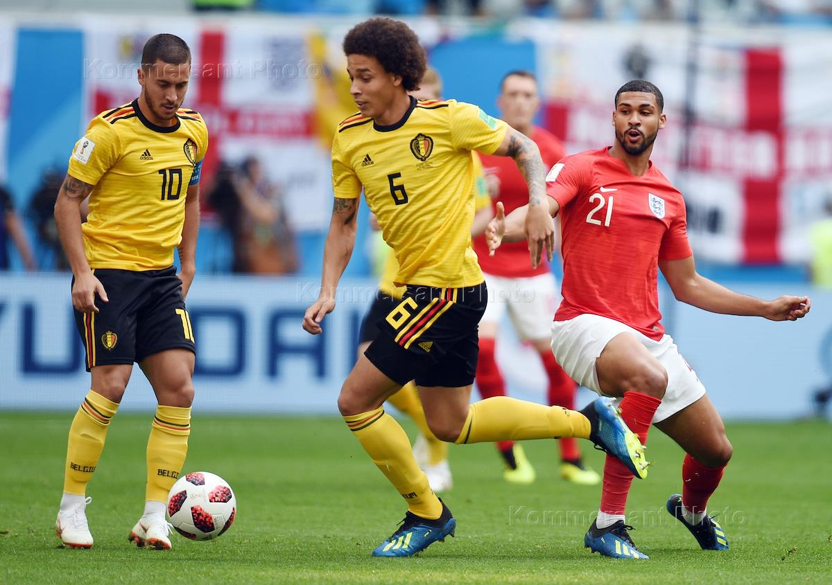 Чемпионат мира по футболу в России FIFA 2018. Матч за 3-е место между сборными командами Бельгии и Англии на стадионе "Санкт-Петербург". Слева направо: игроки сборной Бельгии Эден Азар, Аксель Витсель и игрок сборной Англии Рубен Лофтус-Чик во время матча.