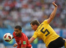 Чемпионат мира по футболу в России FIFA 2018. Матч за 3-е место между сборными командами Бельгии и Англии на стадионе "Санкт-Петербург". Игрок сборной Бельгии Ян Вертонген (справа) и игрок сборной Англии Рубен Лофтус-Чик (слева) во время матча.